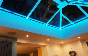Remote controlled, colour changing LED mood lighting around the edge of the K2 orangery roof.